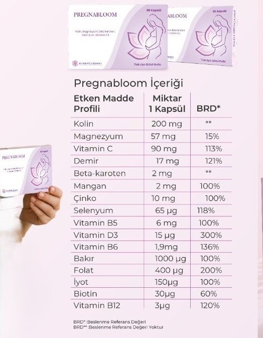Pregnabloom bilimsel verilerin ışığında hazırlanmış zengin bir içeriğe sahiptir. İçeriğinde 16 farklı takviye edici gıda, vitamin ve mineral bulunmaktadır.