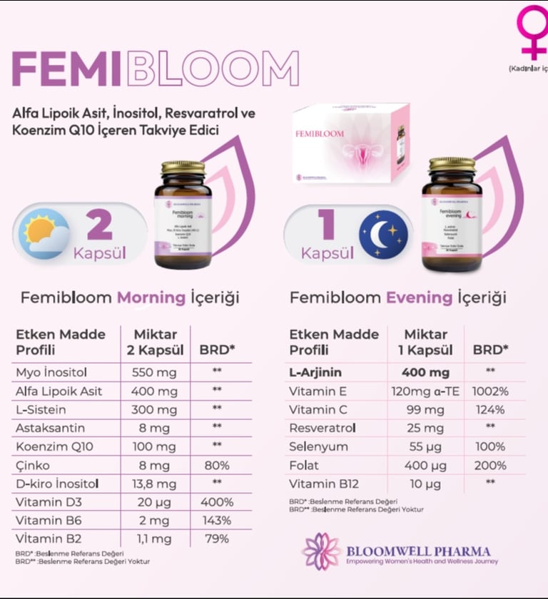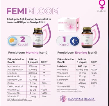 Femibloom sabah ve akşam formlarında toplam 17 farklı antioksidan, vitamin ve mineral içeren güçlü bir takviye edici gıda ürünüdür.